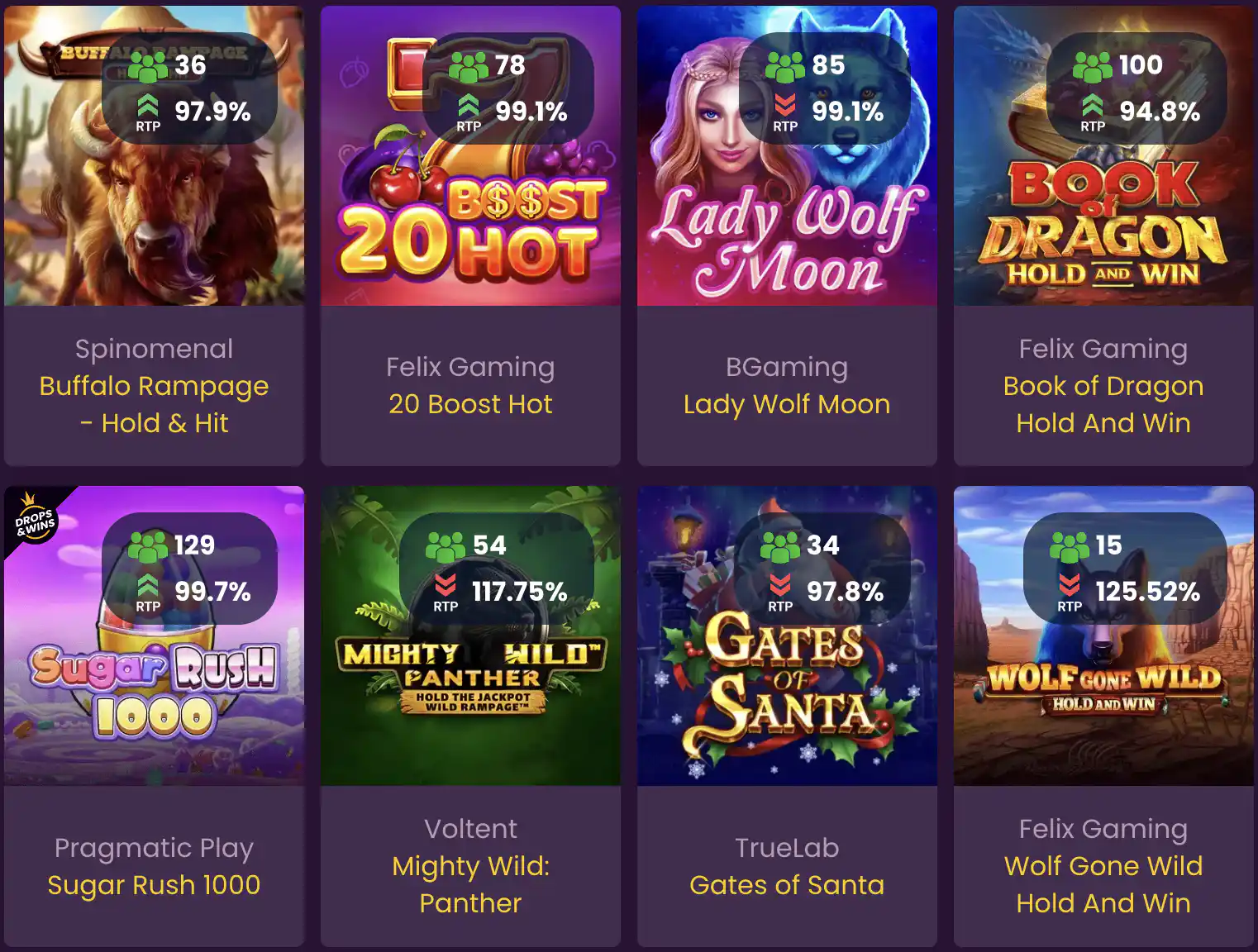 | 🦬 Buffalo Rampage – Hold & Hit – Automat od Spinomenal przenoszący nas w klimat Dzikiego Zachodu. Gra składa się z 5 bębnów i 40 linii wypłat. W trakcie rund bonusowych możesz zdobywać znaczące wygrane dzięki funkcji Rampage, która blokuje symbole Buffalo na planszy. Maksymalna wygrana wynosi do 2 000x stawki, a RTP sięga aż 97,9%! |